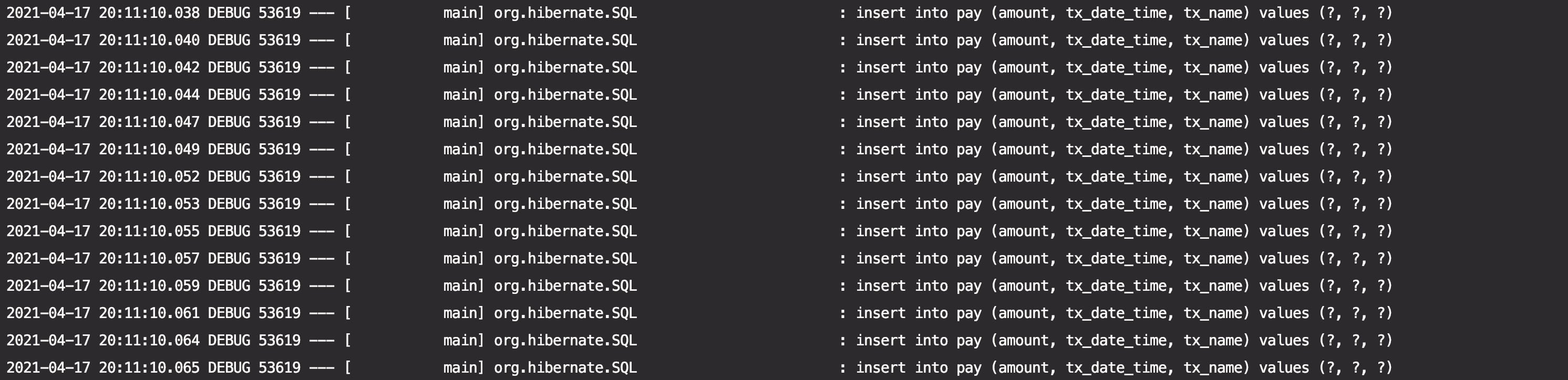 val bulkInsertQuery = "INSERT INTO pay (amount, tx_name, tx_date_time) VALUES (?, ?, ?)"