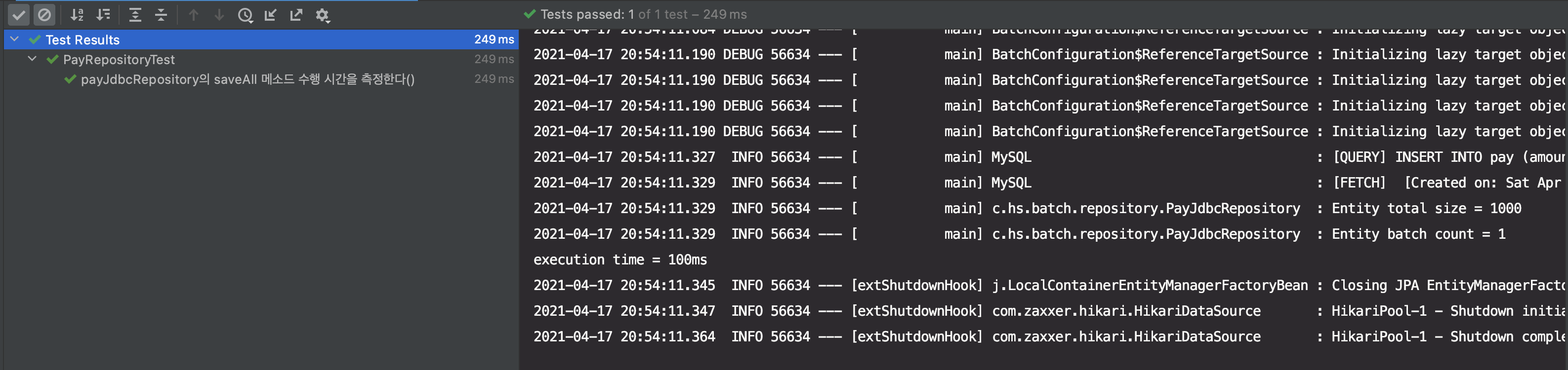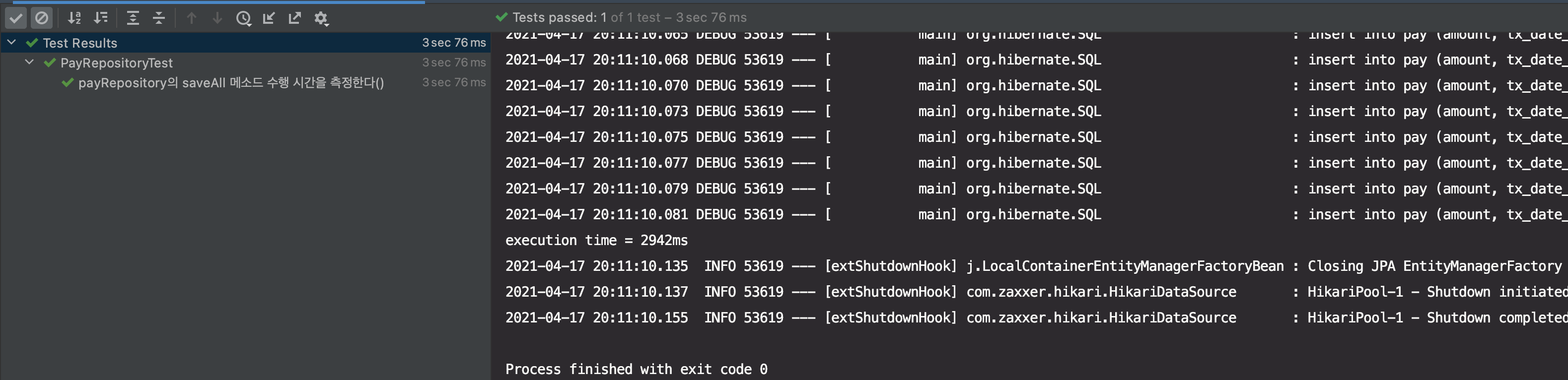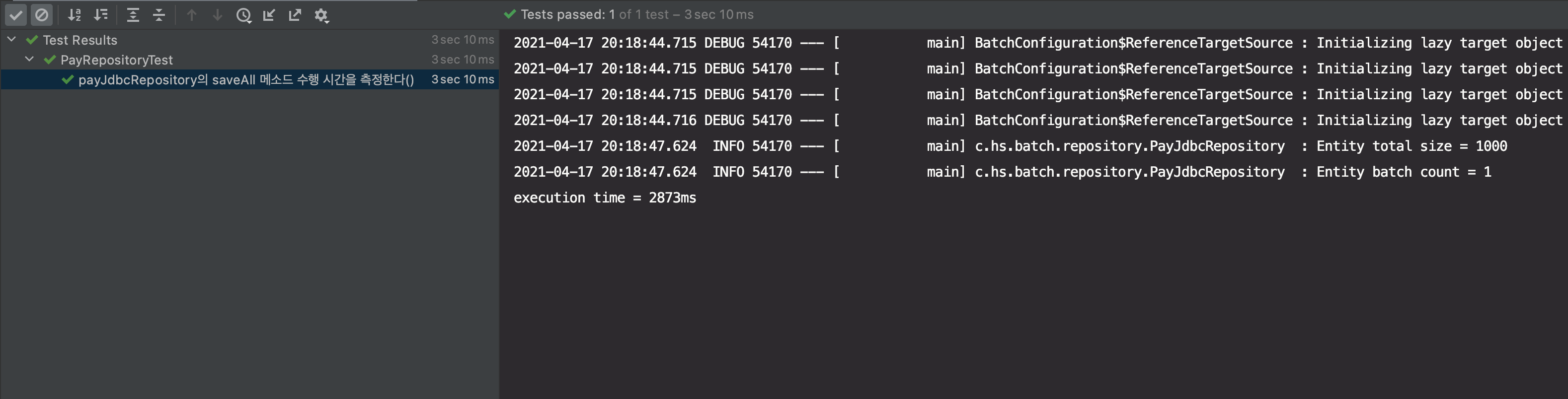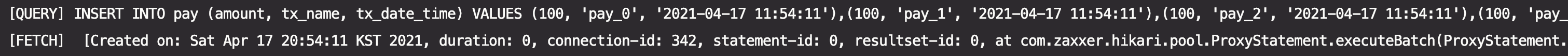 그리고 PayJdbcRepository의 saveAll 방식으로 처리한 결과, 테스트 총 수행 시간은 3s 10ms, 실제 쿼리가 수행된 시간은 execution time = 2873ms 인 것을 확인할 수 있었고, JpaRepository의 saveAll 방식과 차이가 거의 없다는 것을 알게 되었습니다.