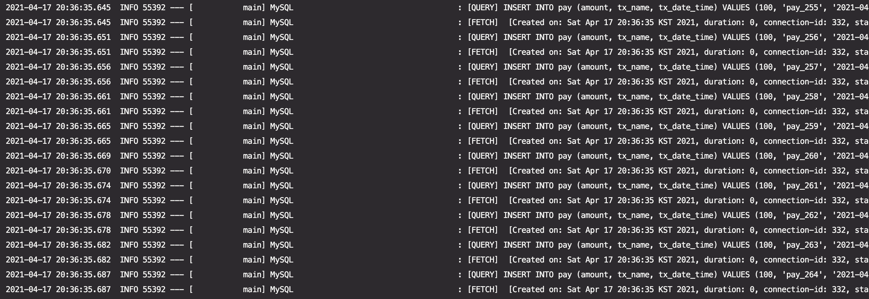VALUES (100, 'pay_0', '2021-04-17 10:29:50'),(100, 'pay_1', '2021-04-17 10:29:50') ....