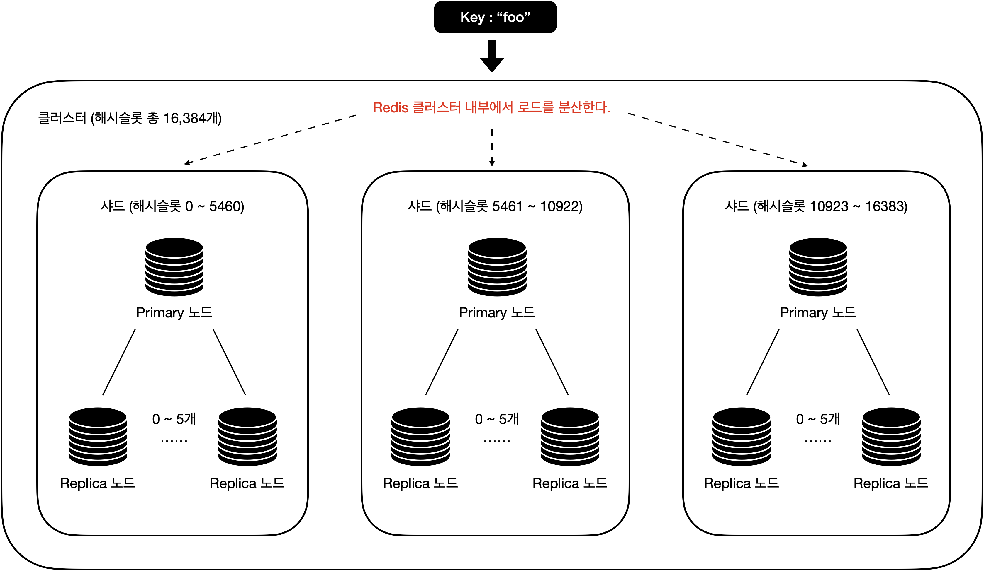 - Key 값이 "foo"인 경우, 해시 슬롯이 10923 ~ 16383 인 샤드에 저장된다.