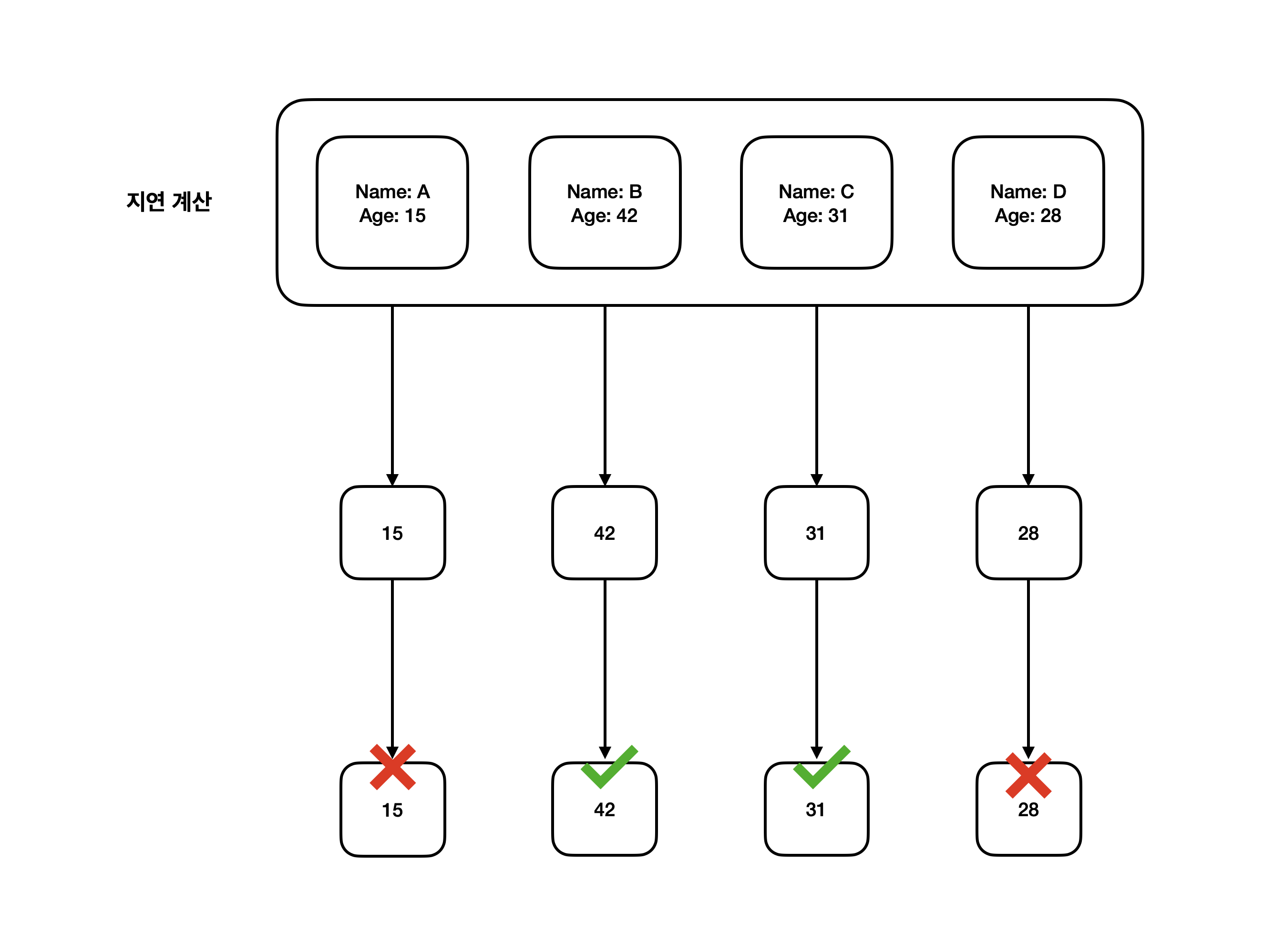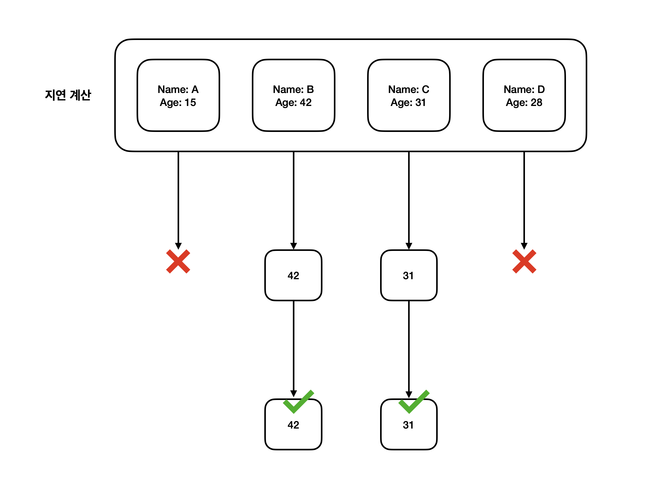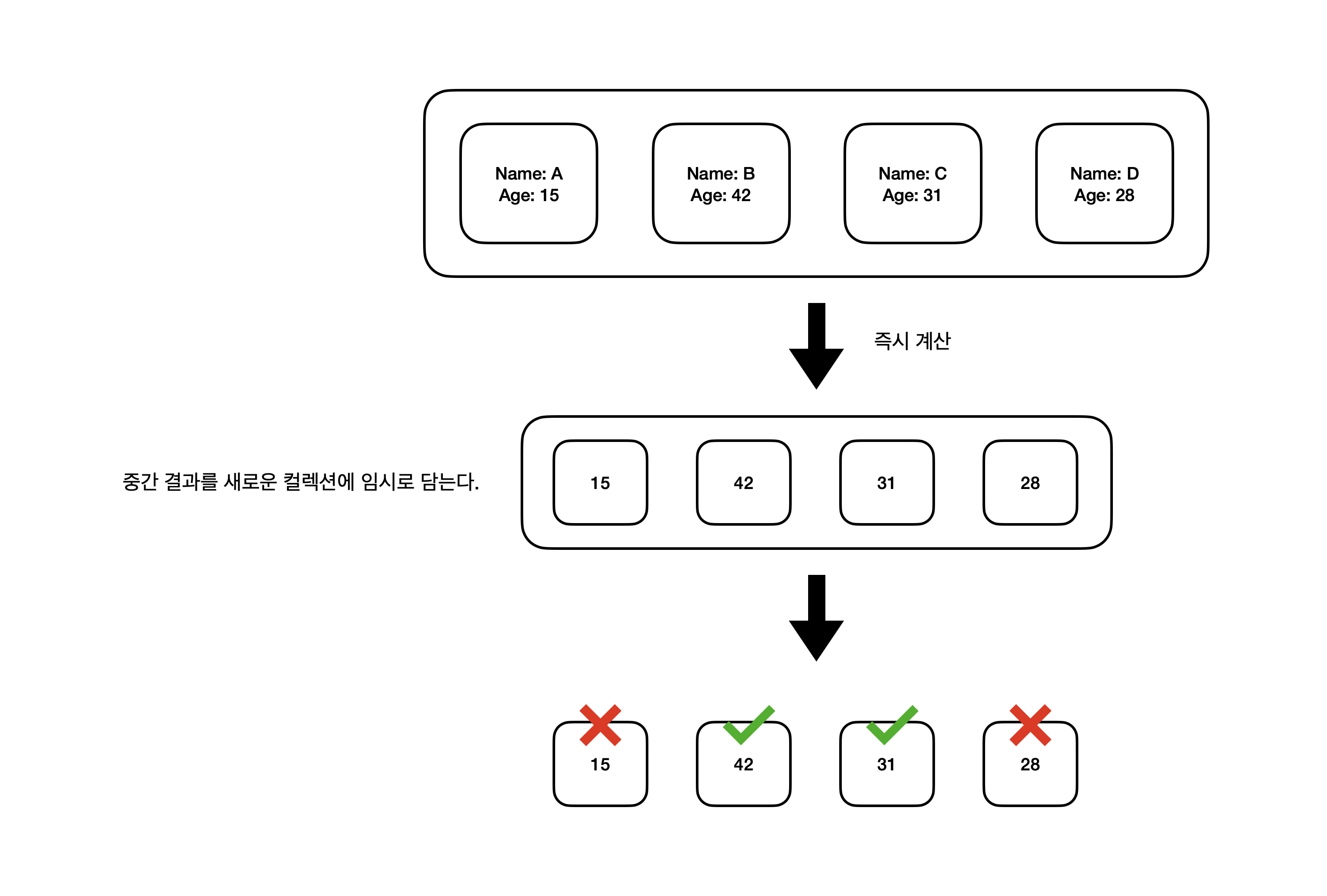 컬렉션 함수의 경우에는 결과 컬렉션을 즉시 생성한다는 특징을 가지고 있다. 따라서 map과 filter를 연쇄해서 처리할 때, 계산 중간 결과를 새로운 컬렉션에 임시로 담는다. 예를 들어 아래와 같은 코드가 있다면, 다음과 같이 처리된다.