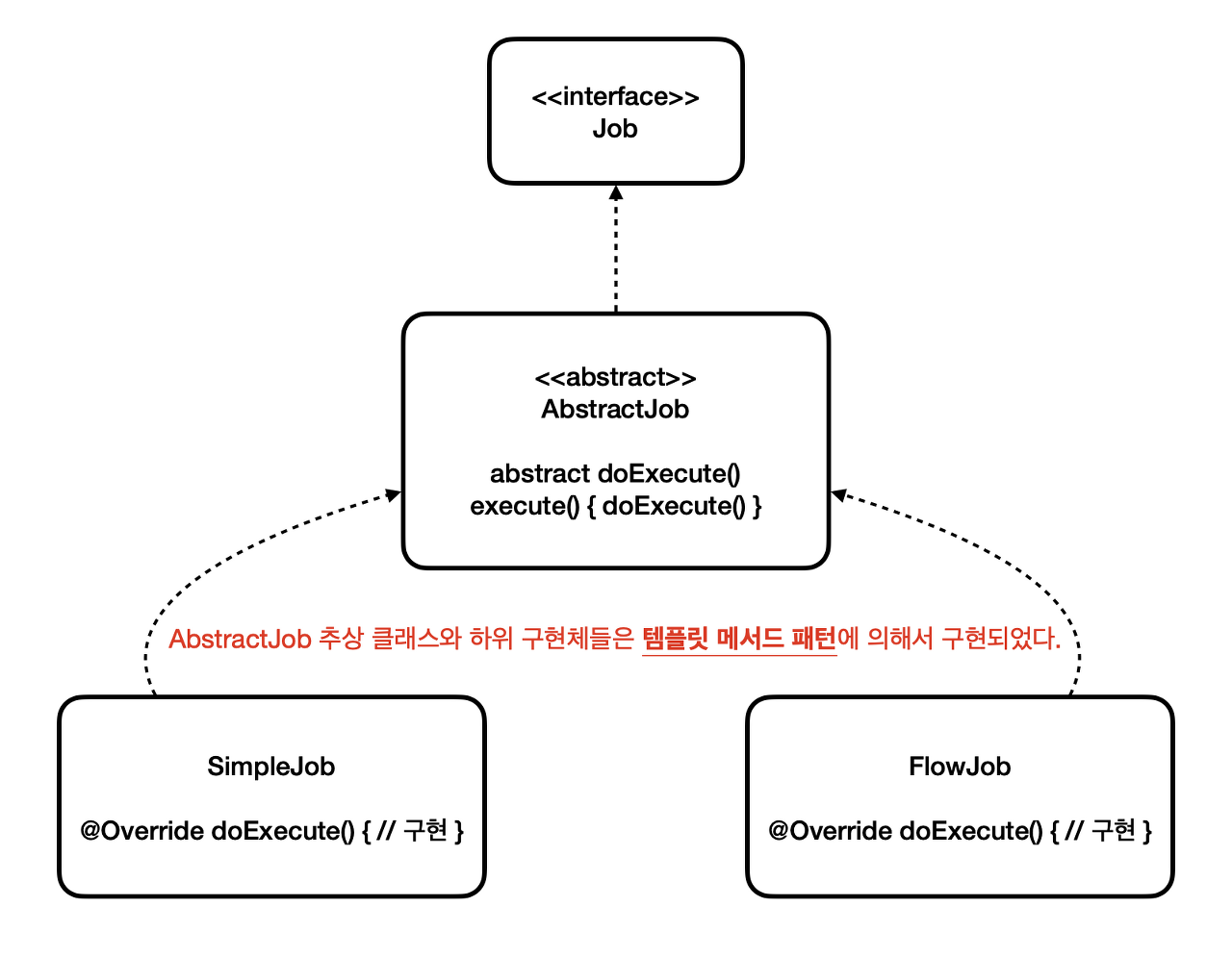 Spring Batch에 Job 인터페이스를 구현한 AbstractJob 추상 클래스와 그 하위 구현체들은 템플릿 메서드 패턴을 기반으로 구현되어 있다.