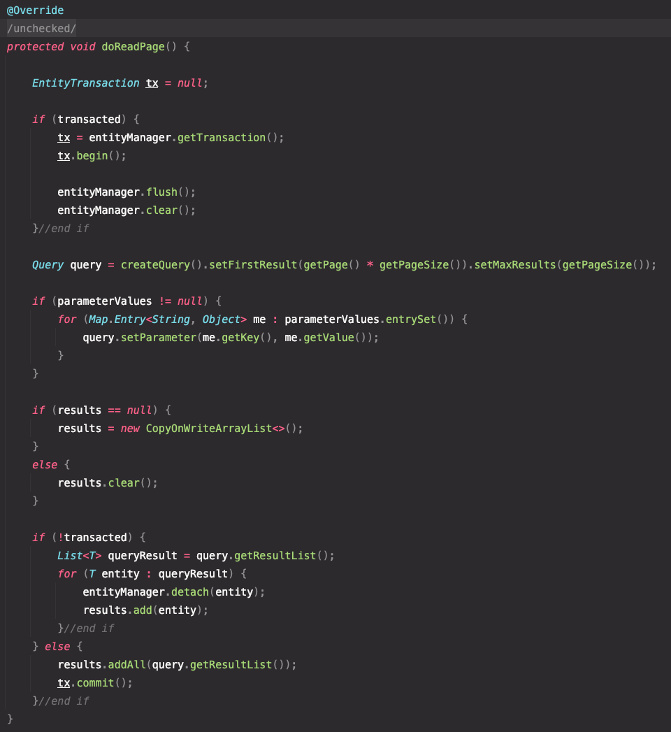하나의 스레드에서 2개의 DB Connection을 획득하려고 하다 보니 Connection이 부족하게 되었고, 이로 인해 Timout이 발생한 상황이었다. Spring Batch에서 Chunk 지향 처리는 Reader, Processor, Writer라는 3가지 구성 요소를 기반으로 동작한다. 그리고 Chunk 지향 처리는 트랜잭션 단위로 진행된다. 이때 Reader에서 JpaPagingItemReader를 사용하는 경우, pageSize만큼 데이터를 조회하기 위해서 트랜잭션을 획득하는데, 추가적인 DB Connection이 필요하다. 즉, 하나의 Chunk 작업에서 2개의 Connection이 필요한 셈이다. 아래의 doReadPage 메서드를 간략히 요약하자면, 다음과 같다.