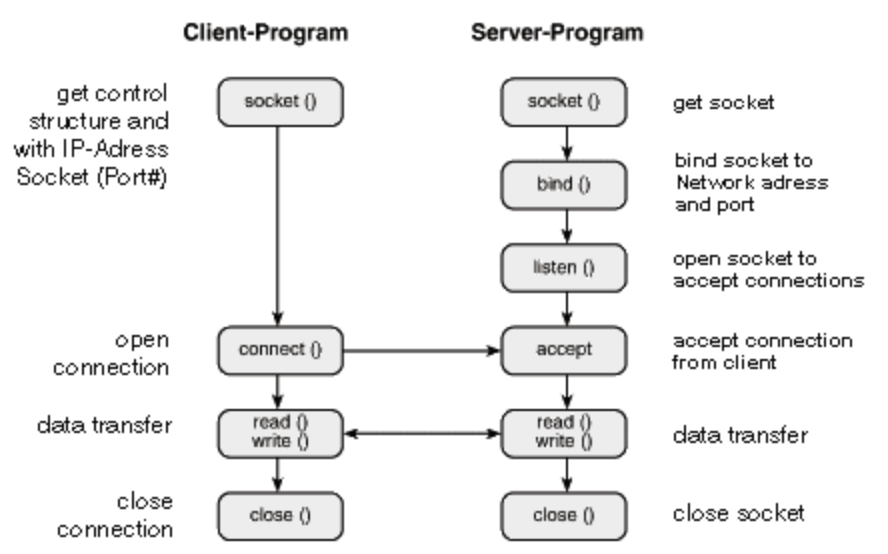 클라이언트 - 서버 프로그램이 실행되면, 커널 영역에서는 통신을 위한 Socket을 생성하는데, 아래와 같은 과정을 거치게 된다.