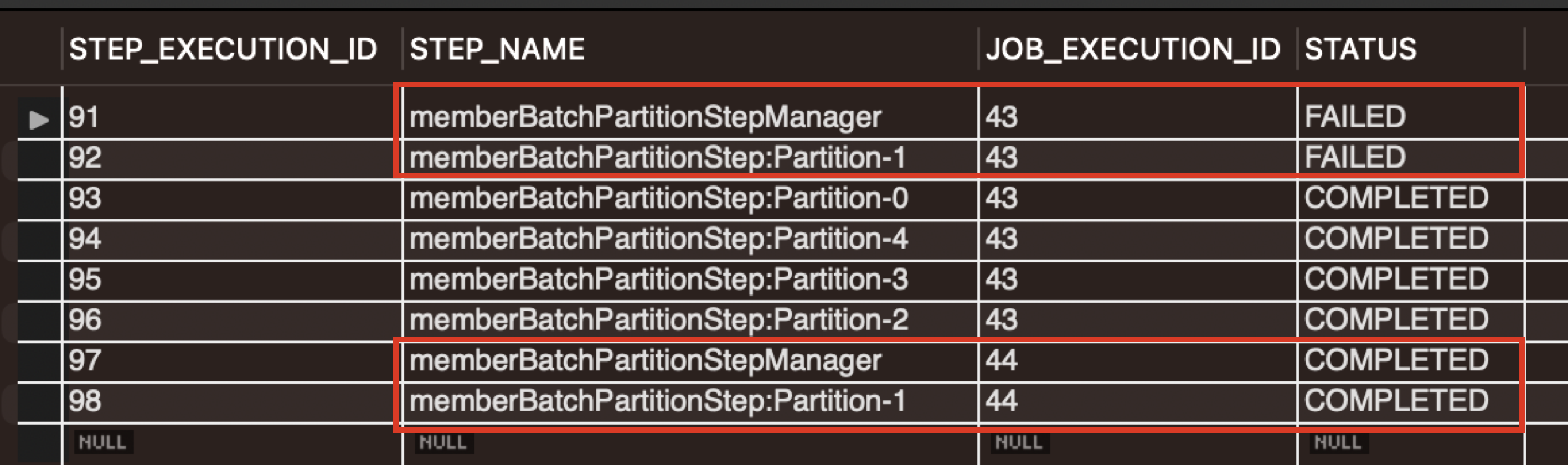 아래의 테이블 결과를 보면, JOB_EXCUTION_ID 값이 43 인 데이터들 중에서 memberBatchPartitionStep:Partition-1과 Step들을 관리하는 StepManager만 실패했다는 것을 알 수 있으며, 다시 실행하면서 JOB_EXCUTION_ID 값이 44 인 데이터 2개가 추가되었다. 즉, memberBatchPartitionStep:Partition-1은 성공했으며, 이에 따라 StepManager도 성공했다는 것을 확인할 수 있었다.