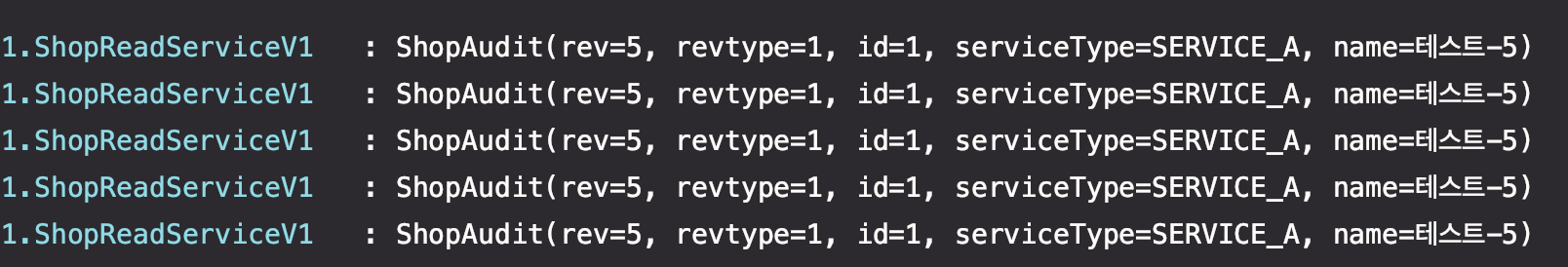 shopId 필드를 제거하고, shopId에 있었던 id, serviceType 필드를 선언했다. 그리고 rev 필드는 AuditRevision 엔티티에 의해서 PK가 자동 생성 되기 때문에 rev 필드를 @Id 식별자로 명시했다. 영속성 컨텍스트는 rev 필드만 보고 동일성을 판단할 수 있기 때문에 더 이상 문제가 발생하지 않을 거라 생각했다.
