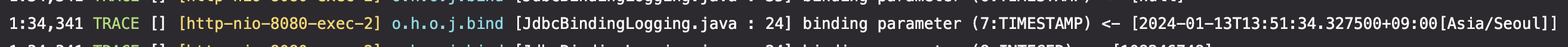 orm.jdbc.bind: trace # Spring Boot 3.x 이상 부터는 'orm.jdbc.bind' 를 사용해야 바인딩 된 쿼리 파라미터를 볼 수 있다.