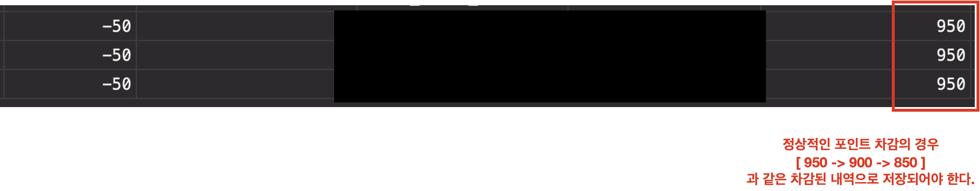 포인트 차감의 경우, 950원 -> 900원 -> 850원으로 반영되어야 하는데 3개의 내역이 모두 950원의 내역으로 반영되어 있다.